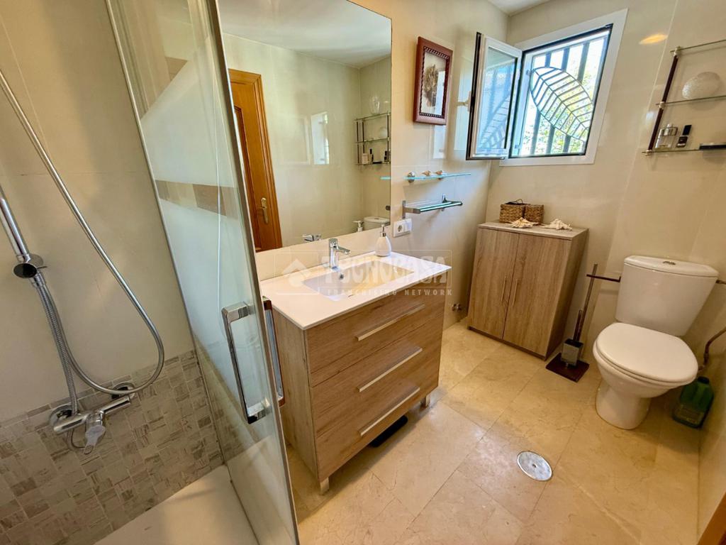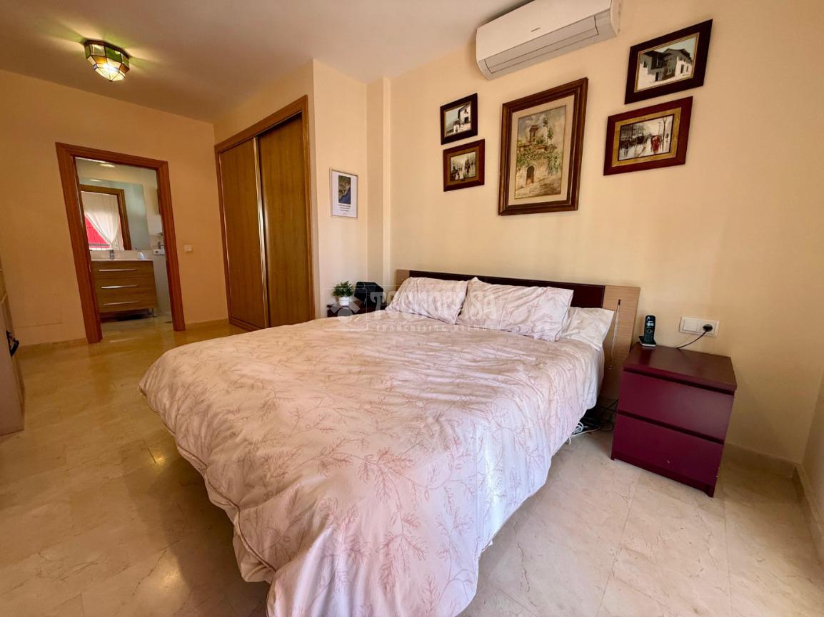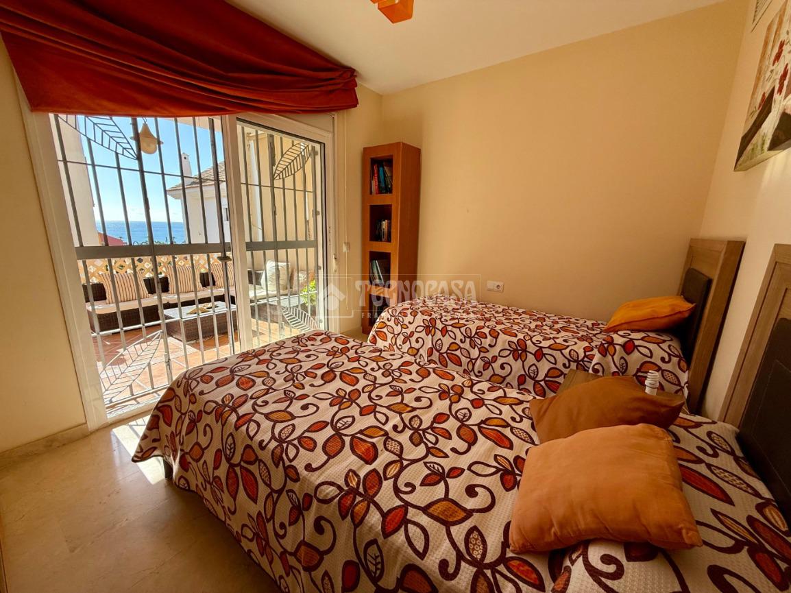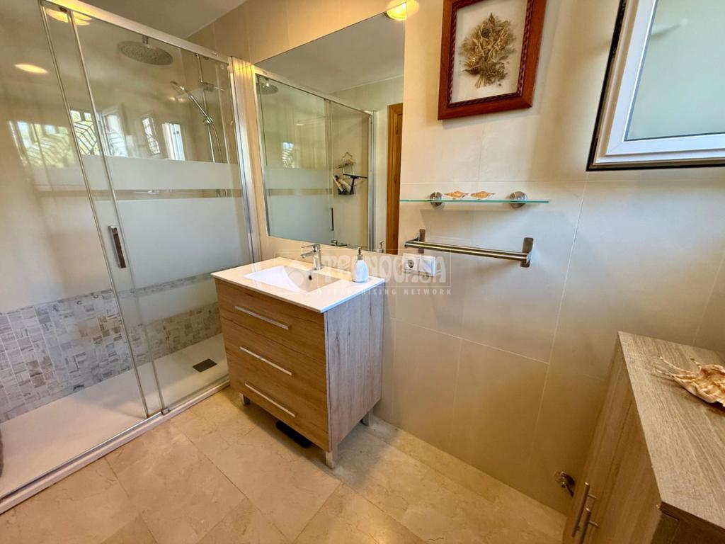 La planta principal, donde se sitúa la entrada, ofrece una excelente distribución con dos dormitorios. Uno de ellos cuenta con baño en suite reformado con plato de ducha, armarios empotrados, split de aire acondicionado y salida directa a la terraza conectada con la piscina. El segundo dormitorio también dispone de armarios empotrados, vistas al mar y acceso a esta misma terraza, reforzando la conexión entre interior y exterior.