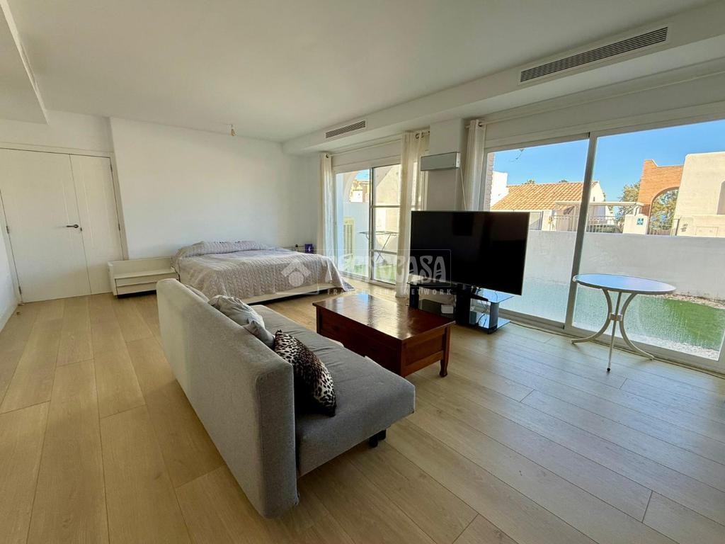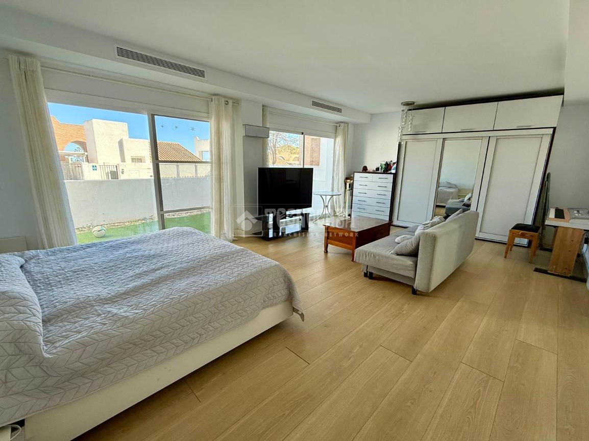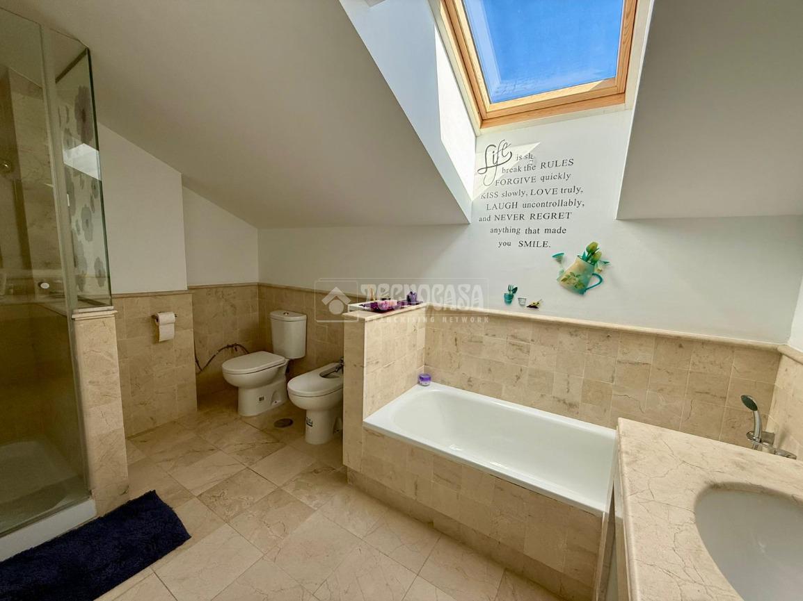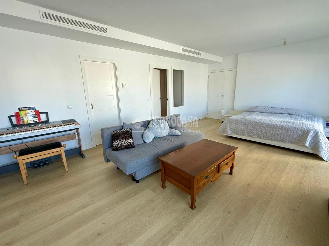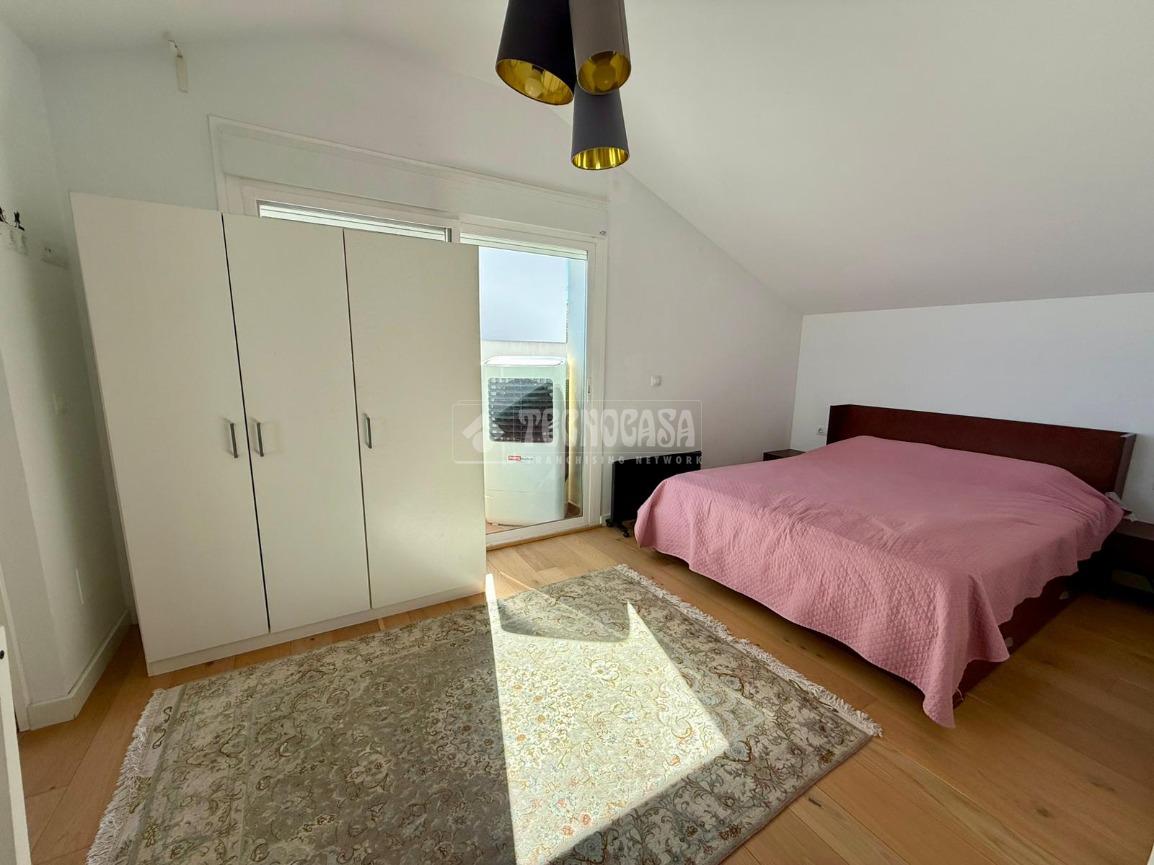 En la planta superior se ubica la habitación principal, un espacio exclusivo que cuenta con vestidor, baño completo con bañera y acceso a una terraza privada con impresionantes vistas. Desde esta planta también se accede directamente a la urbanización.